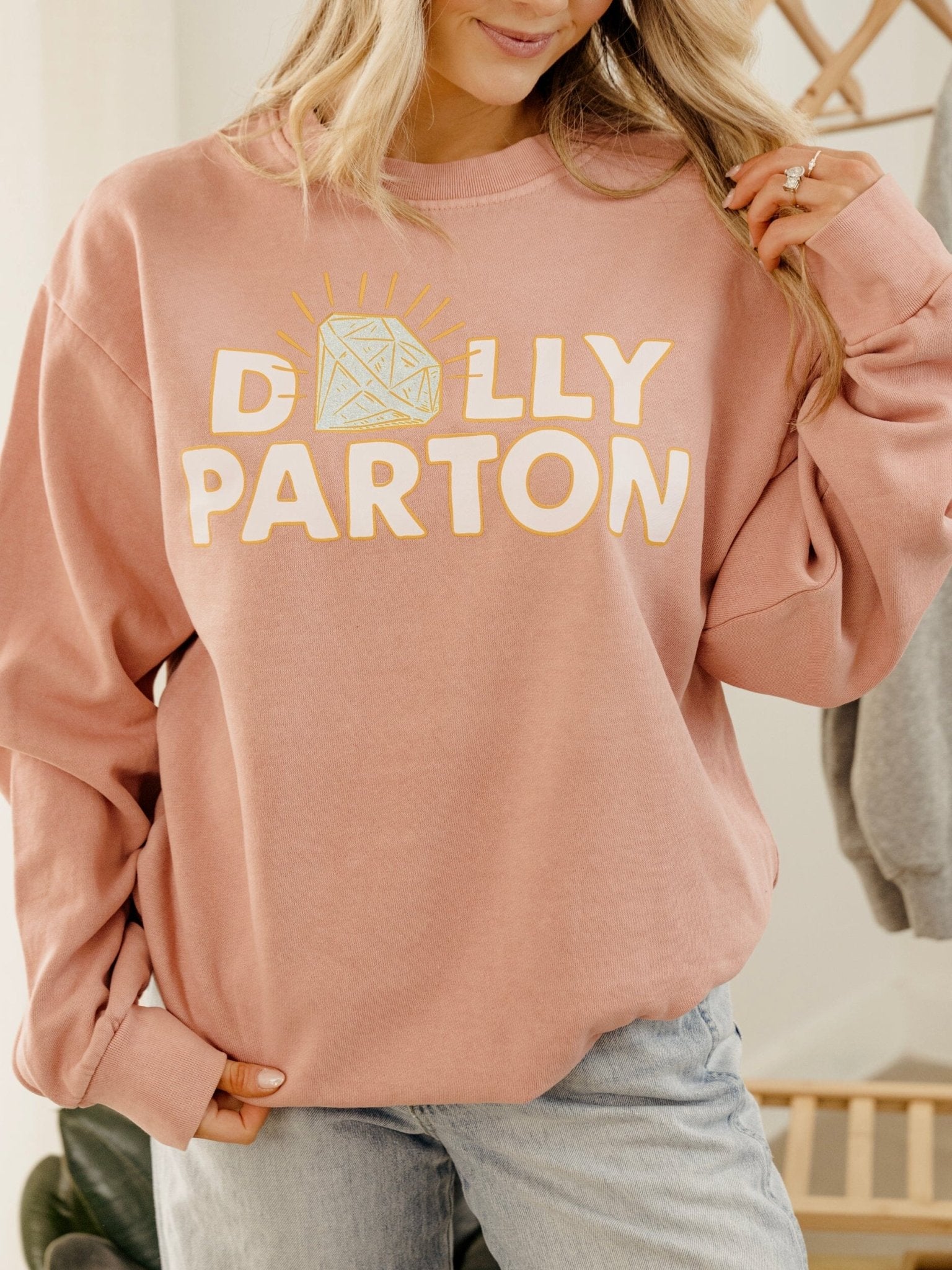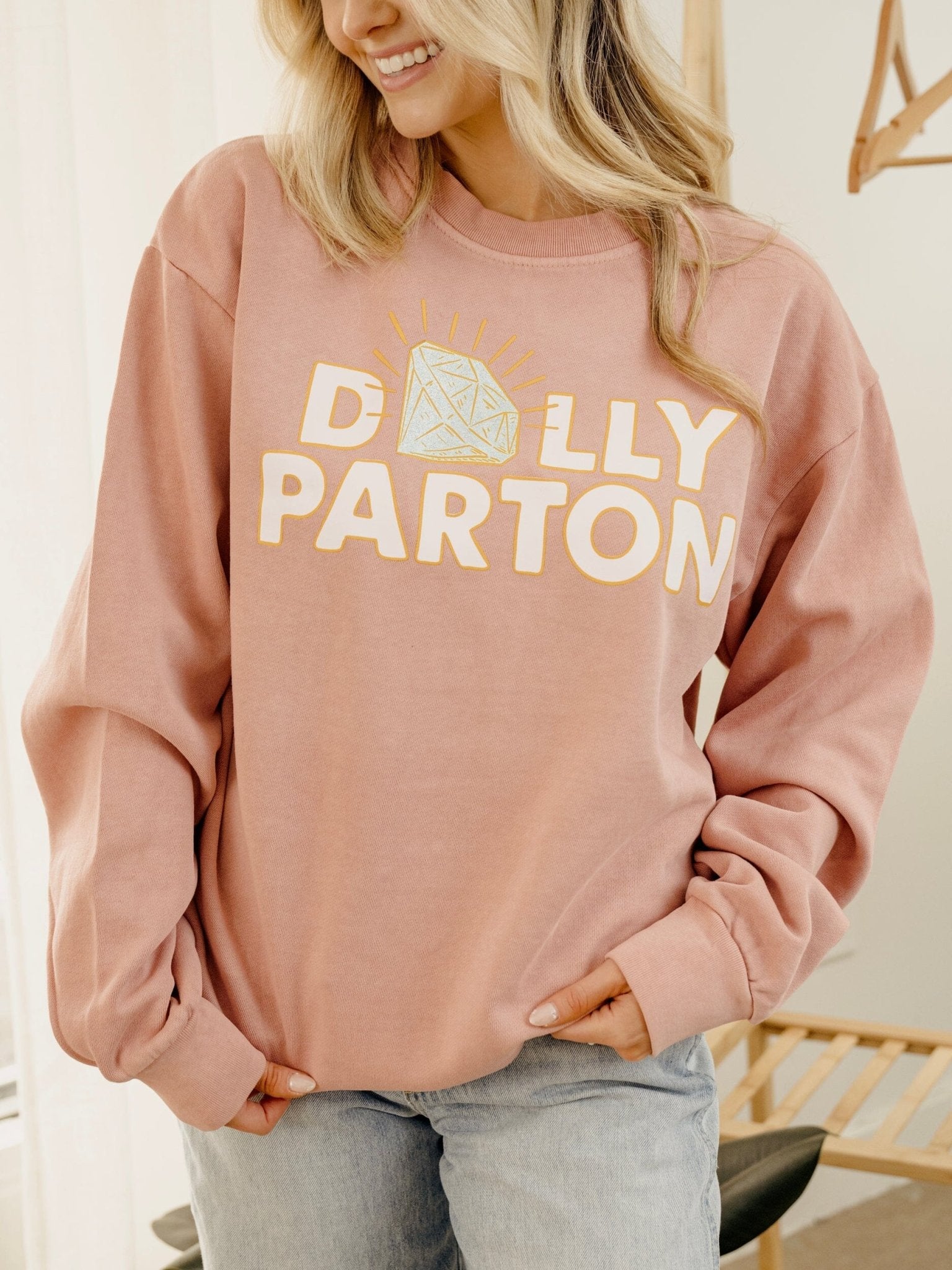 Dolly Parton Glitter Diamond Salmon Hi-Dive Oversized Crew Sweatshirt