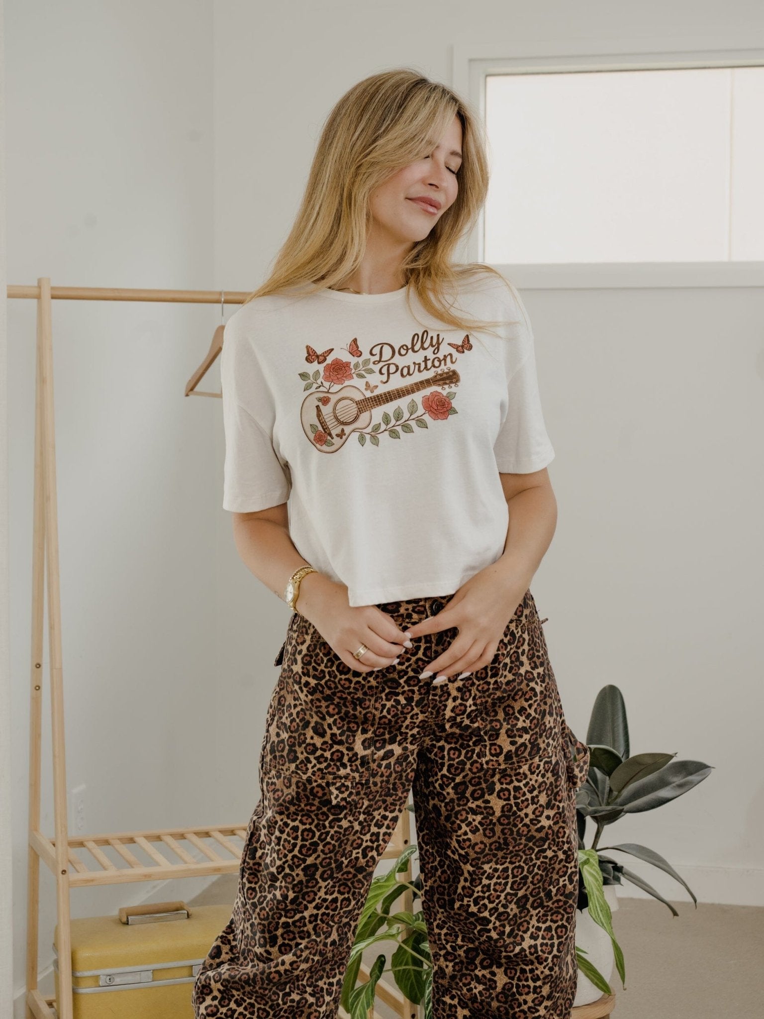 Dolly Parton Guitar Roses Off White Cropped Tee