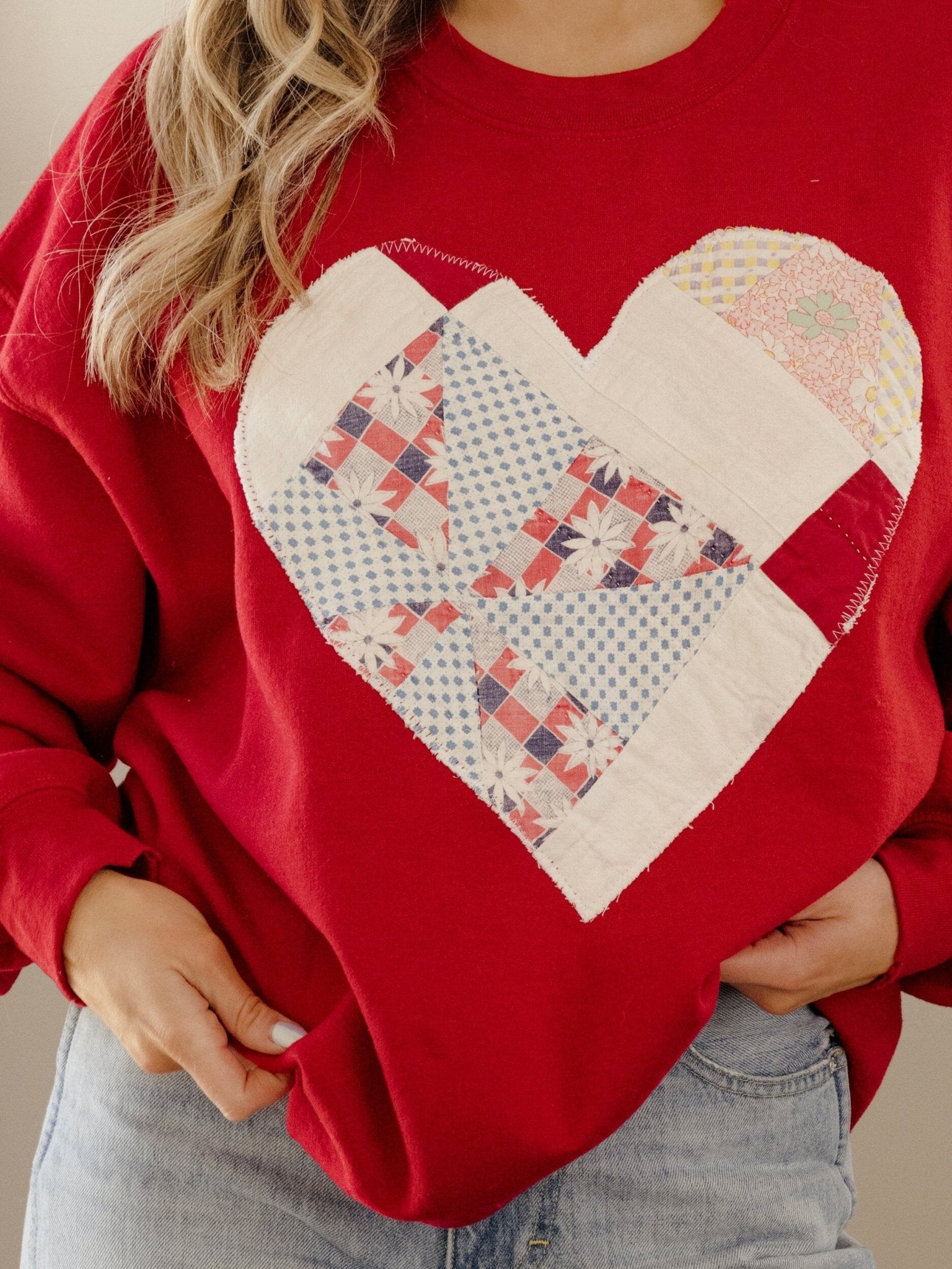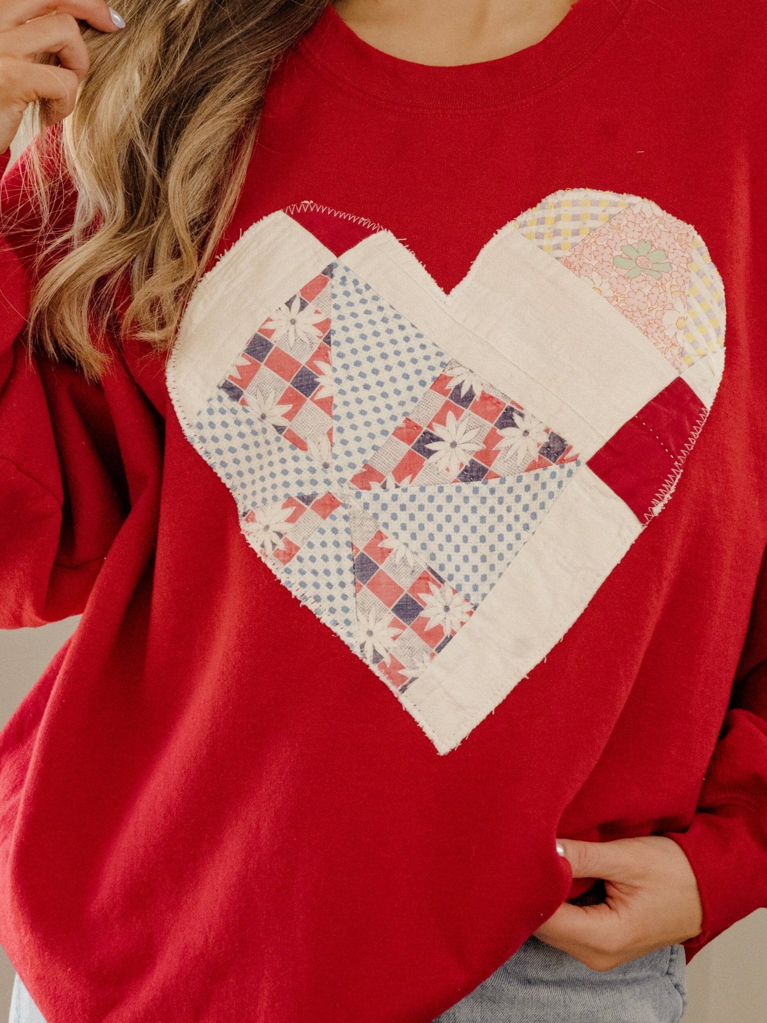 Large Heart Quilted Applique Red Thrifted Sweatshirt