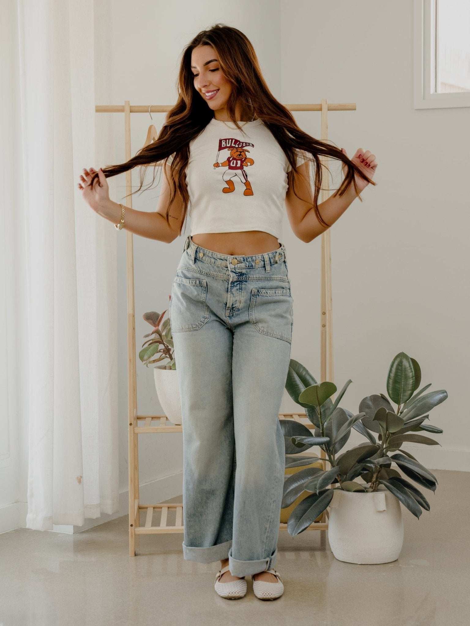 Mississippi State Bulldogs Mascot Flag Off White Micro Cropped Tee
