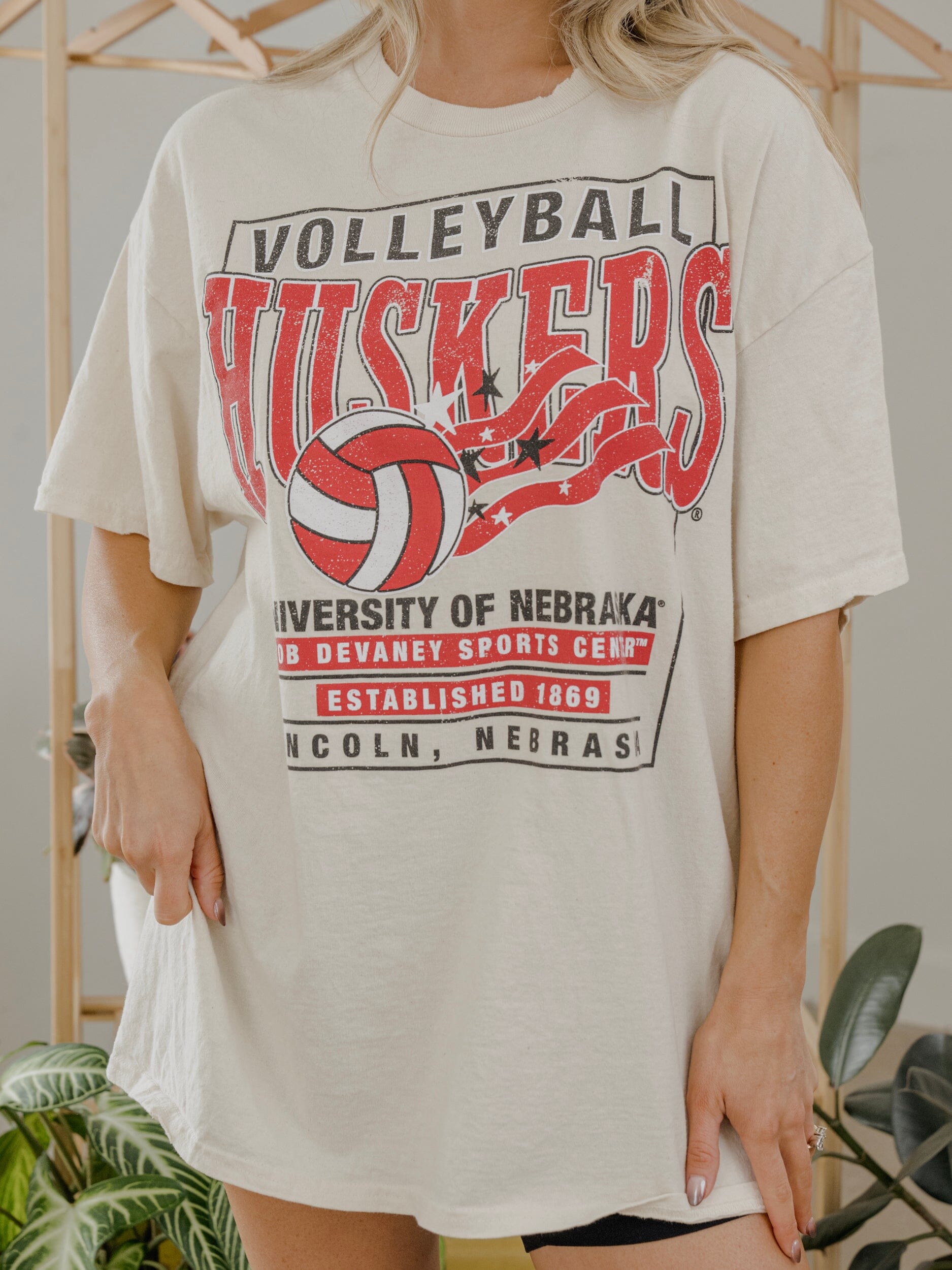 Nebraska Huskers Volleyball Stars Off White Thrifted Tee