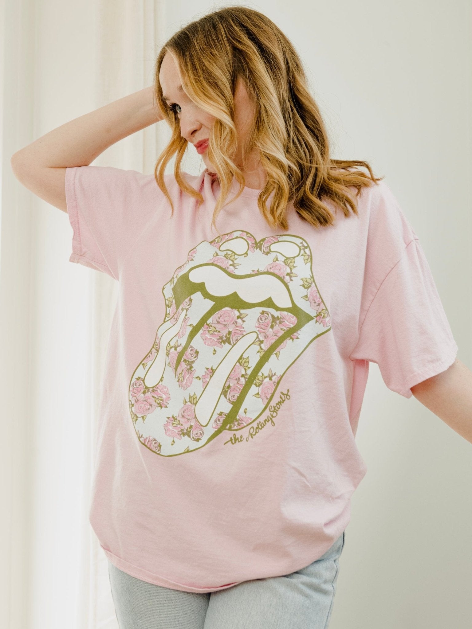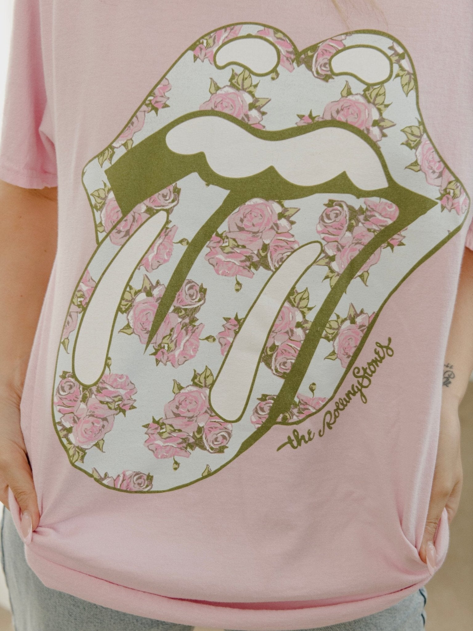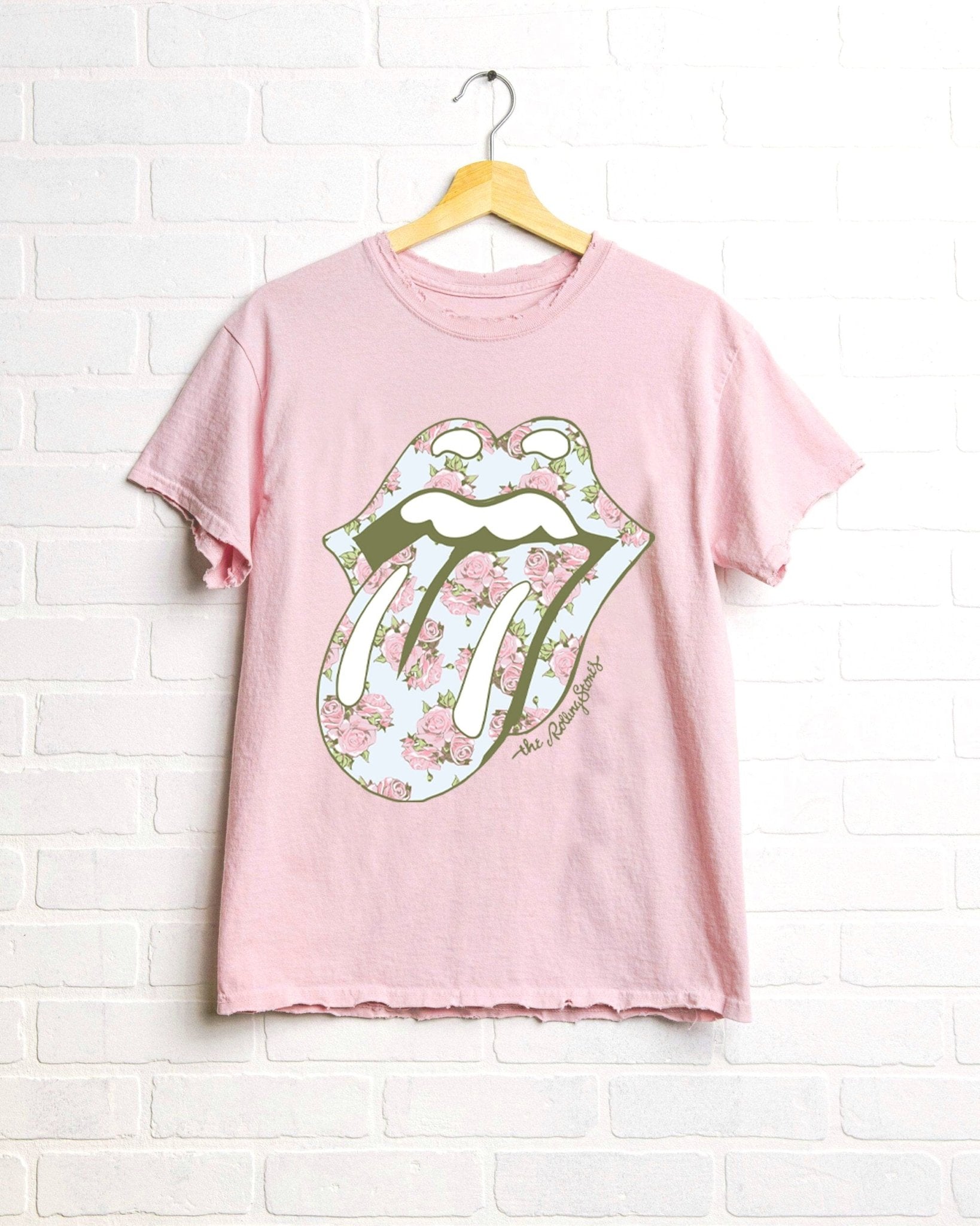 Rolling Stones Floral Lick Pink Thrifted Distressed Tee